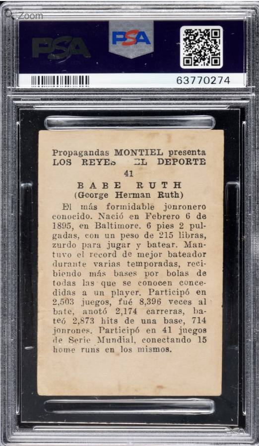 When I was 10, I opened some 1972 Topps and got an Indians team card. One of my friends would sometimes offer me cards out of his brother's cigar box as trade bait. He was a Yankees collector and I'm sure I was offered my share of Mantles. I had no idea who Mantle was. I got a Babe Ruth card for my Indians card. Years later I replaced the precious card with one in about the same shape.Attachment 567138 Years later I stumbled onto 1962 Venezuelan Ruths. They're not worth much and always in rough shape, but I like this one. By the SGC Report, there's a total of 10 graded. One 3 and One 4 and none better. There's a total of 28 graded at PSA, four 3s and 5 better, nothing better than the one 5. I know there's no demand so no value, but I still like the pose and the story on back. |