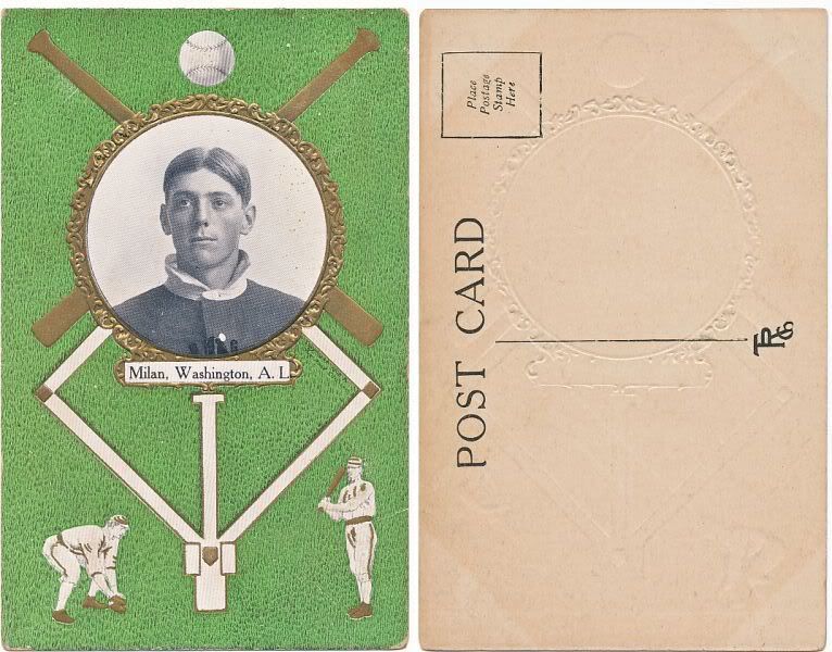 Bill T., fortunately for me, "Deerfoot" Milan's (he led the A.L in stolen bases in 1912 & 1913 and had a career average of .285 with 2,100 hits) last year was 1922, because we might be competitors for his cards if he played a couple of years longer. My collecting focus is cards of ALL the players on the Washington Senators 1924 championship team. I include players who got traded or sent to the minors during the season, some of whom only played a few games with the Senators. I began this collecting focus after many years of collecting WaJo and Sam Rice cards and reaching the frustrating point of being unable to find and/or afford many/most of their cards that didn't have - so, going after cards of all the other players on the 1924 team instantly provided me with lots more card-collecting action.