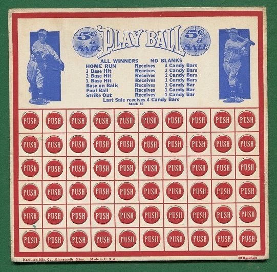the player receives that amount of money -- in Sean's punchboard above, for example, 12, 22, 62, 92, &c', each win a dollar for the person playing, at the cost of a nickel per punch. Many punchboards worked almost identically to that, while other punchboards cost different amounts to play (usually a penny or a nickel per punch), paid out in different amounts for revealing a number or symbol, often paying out not in cash but in candy bars or cigars or what have you. We're not familiar with Diamond Dust baseball cards, so we can't even guess if they're related to the punchboards (not saying they're not). But we've never seen a punchboard that either paid out in or contained baseball cards. Again, this is a little outside of our wheelhouse, but someone on board here who has more hands-on experience with punchboards should have better information. As always, we stand ready to be corrected. |