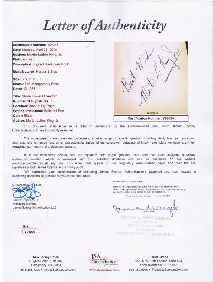 Stride Toward Freedom 1st Edition, Second Print (I-H, 1958). Book is in pretty good shape. Signed by Martin Luther King Jr. on back page with the inscription "Best Wishes" Signature is big and beautiful. Signature is upside down (if that makes sense?) It is my guess that the person that had the book signed held the book out for him to sign it. Full letter JSA Asking $SOLD Will upload more pictures documenting condition of book later this evening. https://www.collectorfocus.com/image...toward-freedom https://www.collectorfocus.com/image...toward-freedom https://www.collectorfocus.com/image...rd-freedom-coa |