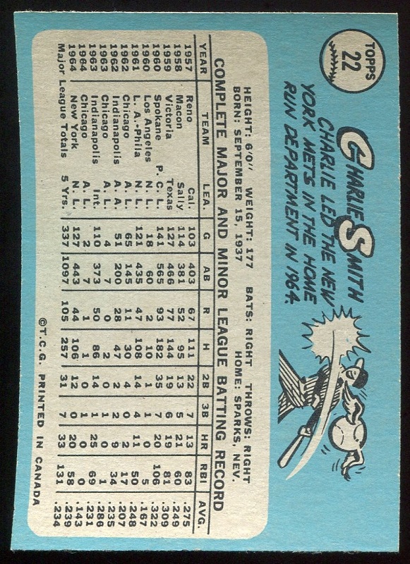 1965 Topps baseball #22 Charlie Smith is pricey in nice condition.Hard to find centered I have read.I would like to hear more about this card.