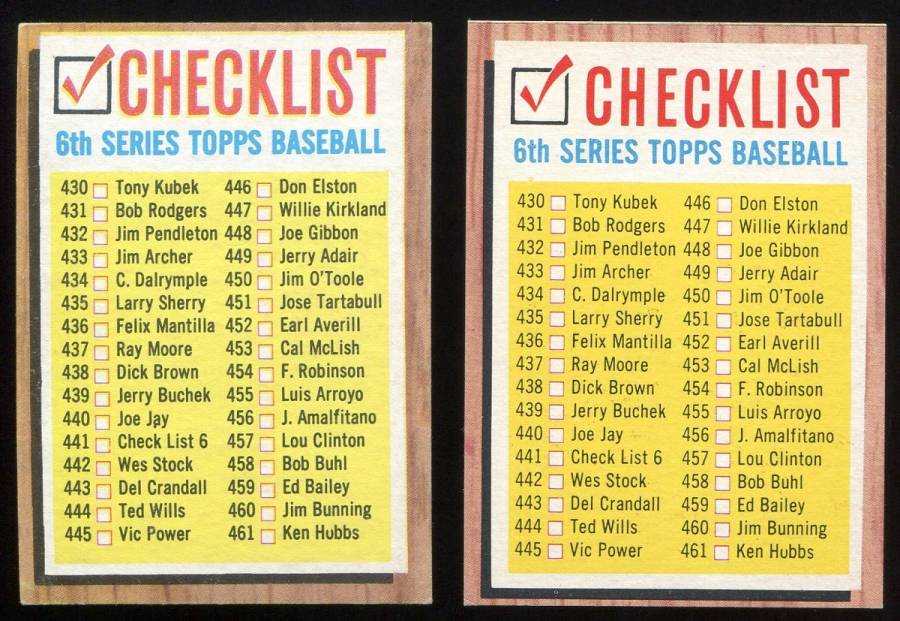 https://www.collectorfocus.com/image...ous/77782/1962 The card on the left is the one with "Checklist" in larger letters - the card on the right is the one with "Checklist" in smaller letters. |