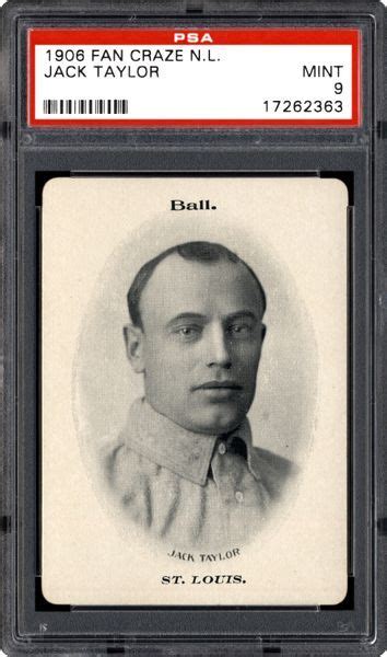 Jack Taylor had 187 consecutive complete games from 1901-1906 pitching for both St. Louis and Chicago. He was more than willing to fill in between starts at several positions accounting for the 4 errors at third base in a clue. In his career he started nearly 300 games and was relieved only 8 times. He has rolled over in his grave in Ohio several times watching this years postseason games. Jack is not in the Hall of Fame, but does have two baseball cards. Here's one of them. What's the other?