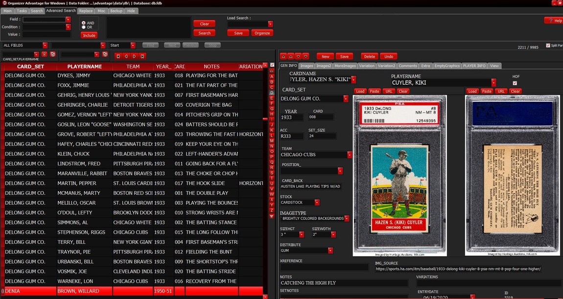 I use a database program from primasoft and have for probably twenty years. It has multiple uses; e.g., I created two separate databases for work-related matters, one for post-war stuff, minor league cards, etc. It comes with a sportscard template but frankly I haven’t looked at that; instead I created my own fields and layout. The program is fully customizable and allows importing, so spreadsheets can be incorporated without great difficulty. Similarly it allows exporting so that you can create spreadsheets; i.e. “reports”, and also linking to websites or internal files is available. Here is an example screen from one of my databases (if the color combo is not to your liking the program gives you pretty much a full palette to change it, and the right panel does not have to be the same as the left). FYI, my computer skills are marginal, so know that little to no tech background is needed.