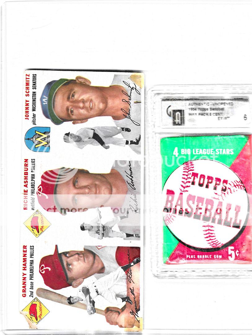 On another '54 note, one of the main cards from the set that I did not have was the Ernie Banks RC. However I was recently digging through some long, lost cards and came across a zip-lock bag of '50s Topps and Bowman cards that sometime ago had sustained water damage. In that pile was a Banks, or what was left of a Banks. Per another thread that showed a PSA 3 '56 Aaron, I'm hoping for at least a '2' on this one.