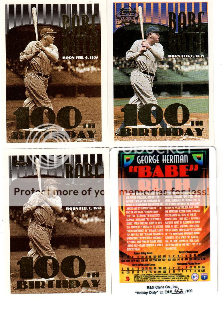 The 1995 Topps set had two versions of card # 3, a Conlon photo, celebrating Ruth's 100th birthday. There was also a 3C version of the card in the Conlon sets