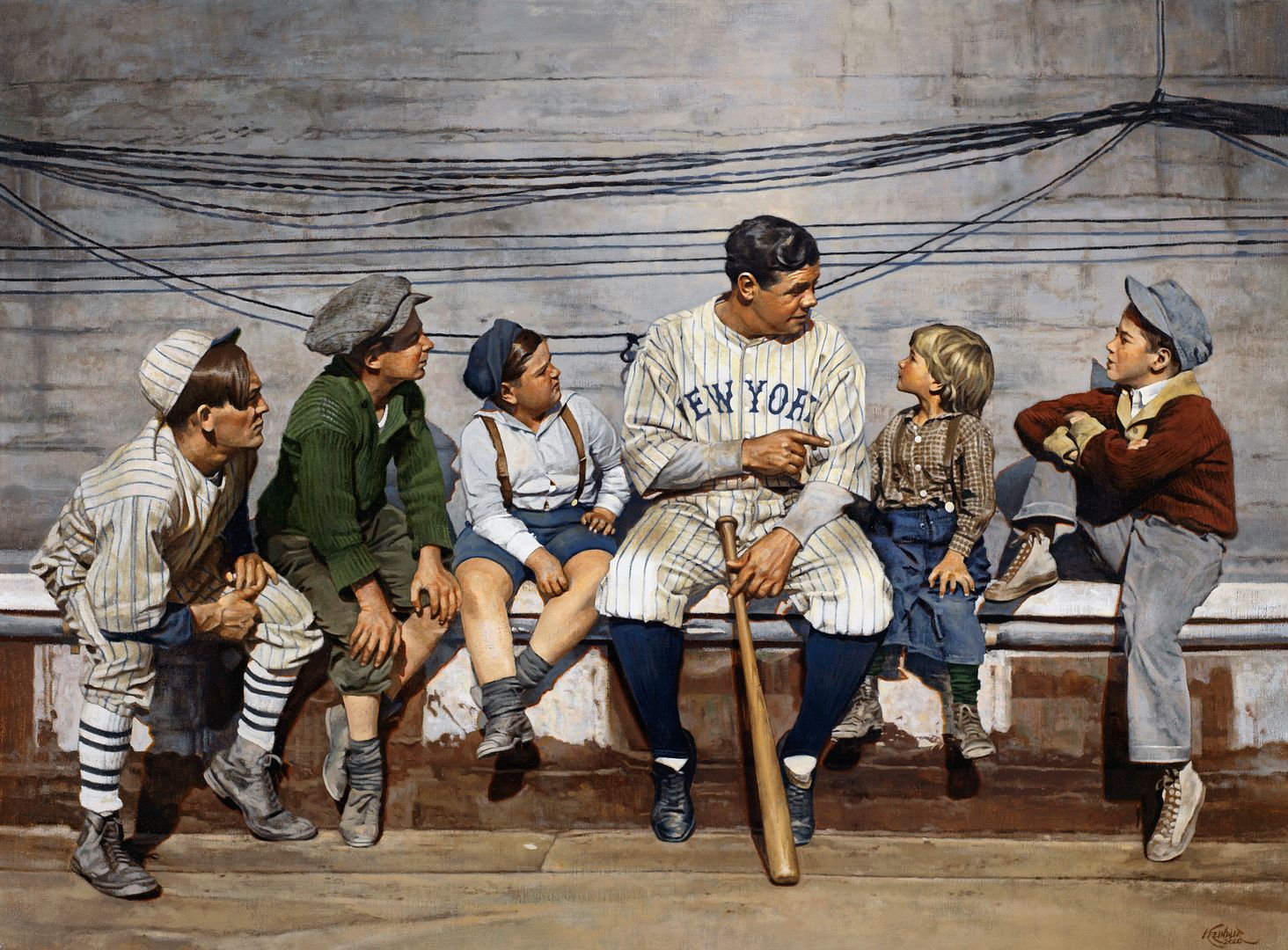 It really was a joy to paint that one, especially because of the subject matter. And obviously, the light was also a big selling point. Here's one that I thought had some similar kind of vibes to it: ![]() Babe Ruth, November 29, 1924, 38" x 28" In terms of the scene, well, I don't know a ton about it. What I could gather is that it's part of the barnstorming tour that Babe was on in the fall of 1924. I know that at least some of it took place in northern California, but I'm not sure how much, or for how long. I wasn't able to find much information in the papers, but I also might not be looking in the right place. The slug on the back of the original photo listed the date as November 29, though I think that that might be too late, as I have proof that he was touring in late October, but am not sure when the gigs actually stopped. It's worth noting that the uniform he's wearing might not be specific to that barnstorming tour, as it reminds me a LOT of the jersey worn by the players during the 1913-14 world tour. I wonder if it's actually from then? Anywho, if you know the original photo, it's hard to think of anybody other than Norman Rockwell when looking at it. In that regard, I think one needn't look any further than the subject matter: a ballplayer interacting with kids. It's a motif that's often a winning combination, and something that Rockwell utilized often in his work. It may not have always been a relationship between a sports figure and a child, but it always seemed to be somebody older--maybe a mentor or authority-type figure and some neophyte-sort. Many people think that it's those illustrated interactions and insinuated relationships that make Norman's work so sentimental and sweet. I feel like those are the same qualities that I tried to imbue into this painting (though considering the photo is so great, I didn't have to do much). And let's be honest, that sense of saccharine is only heightened by the fact that the depicted ballplayer is none other than Babe Ruth. If it's not obvious, Norman was-and still is-a huge influence on me. As a painter, I was first attracted to his technical abilities--the way he rendered form and handled the medium was just truly exquisite. And in my opinion, his design of the picture plane was equaled by very few artists or illustrators during that time period. He was a throwback to Howard Pyle, who treated his paintings as perfectly orchestrated stage performances where every single subject and its placement was incredibly important to the telling of the story, and creating drama in the picture. Still to this day, I can thumb through books of his work and sit there in awe of the kind of emotion he was able to elicit. I feel like if by the end of my time here, I can even touch the hem of his garment as far as that sort of thing is concerned, I would die a happy man. Maybe doing paintings like these is a step in a good direction for that. Ya know, dying. Hope y'all dig it, and as always, feel free to comment, critique, question or throw things. G