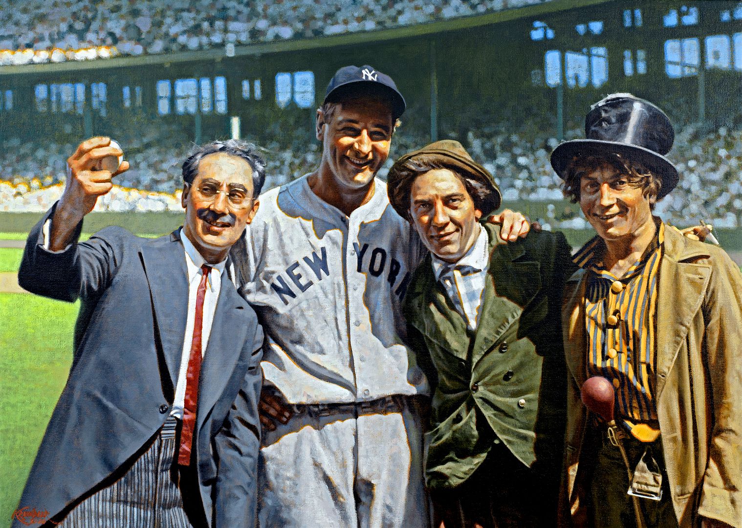 So, here's something y'all might not have seen before (unless you follow me on any social media platforms): ![]() Groucho Marx, Lou Gehrig, Chico Marx and Harpo Marx, August 2, 1936, 28” x 20” This was maybe the most fun I've had on a painting in a long time, and was completed a few months ago. In my eyes, it just might not get any better than a smiling Lou Gehrig with Groucho, Chico and Harpo. The image was one that I had had in my files for a long time, and though a few people toyed with the notion of commissioning it, it wasn't until a year or so ago that somebody pulled the trigger on the commission. And I’m super happy they did. There were two major issues I had while painting this thing. The first was that I could never find much background information about the scene. On a few websites here and there, the image is dated to 1933, which was about as much as I had to go on. I could tell that it was taken in Cleveland because of the ballpark architecture, but I had my doubts about that year, as I thought Gehrig looked a little older than he did that year. I ended up comparing Lou's jersey to some existing exemplars I had access to images of, be it the jersey itself or just decent photography. I was able to date it to the 1936 season. After a ton of newspaper diving, it was apparent that the Indians only played at Cleveland Municipal on one occasion that year, as they used League Park for all of their other home games. It turns out, that date was August 2nd, in front of over 65,000 fans. The clubs fought to a 4-4 tie that ended after the 15th due to darkness. It turns out, the Marx Brothers were in the middle of a five-city tour of "A Night at the Opera" stage performances, and that afternoon made it onto the field before game time to laugh it up with the teams. There weren’t too many tidbits about the Marx-side of things, other than that they were in costume, and that they were clowning around with George Selkirk specifically. It’s a shame that there are no other photos from that day in circulation. The second, and probably more important issue, was the fact that I had never seen a copy of the photo in stellar quality--all of the versions I had seen were pretty blown out, thereby eliminating a lot of crucial painting information for the painting. It's a semi-common problem with photos showing bright sunlight unfortunately, and that's doubly-so when you're combining black and white photography with the fact that the image was taken 80 years ago. It took a while to find something I could work off of, and even then, it wasn't crystal clear, but in the end, I think it turned out to be a really nice piece. And let's face it, the subject matter carries it. One thing the light DID lend itself nicely too was all of the reflected light coming back into those shadows. You can see that especially in the Lou whether it’s the hints of the green from Chico’s coat reflecting back into the jersey, or the lit fabric coming back into Gehrig’s chin and jaw. Hope you guys dig this as much as I did making it. Please feel 100% free to critique, comment or ask questions. Always. Thanks for reading! Graig