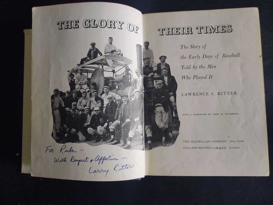 An amazing piece of history. This first edition copy of The Glory Of Their Times belonged to Hall Of Famer Rube Marquard. It was given to him by the author of the book Larry Ritter. Ritter has inscribed an inside page "For Rube - With Respect and Affection - Larry Ritter". There is a JSA sticker on the other side of this page.