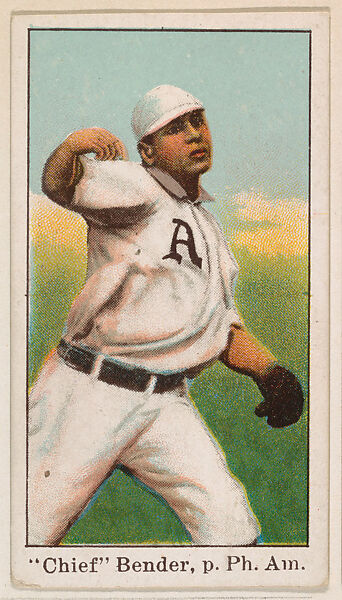 Here are my T213-2 Bender with Trees. I have the 1914 A's card and the 1915 Baltimore card. I don't have the with trees 1916 Phillies card. It must be a 4 and not an A b/c it is not on his A's card. It reminds me of the T206 Marquard with the 8 on the sleave...Rob |