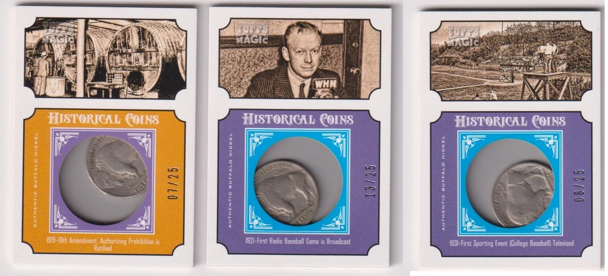 Very cool relic cards contain an actual Buffalo nickel; comemorating early 20th century events, Each card limited to /25 produced.