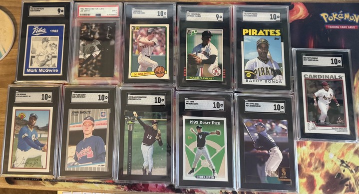 1982 Red Lobster Cubs Lee Smith PSA 9: $70 1983 Donruss Wade Boggs SGC 10: $105 1985 Leaf Roger Clemens SGC 9: $50 1986 Topps Traded Barry Bonds SGC 10:$350 1989 Bowman Ken Griffey Jr. SGC 10: $350 1989 Fleer Glossy John Smoltz SGC 10: $70 1992 Classic Four Sport Derek Jeter SGC 10: $45 1993 Topps Derek Jeter SGC 10: $260 2001 Upper Deck Ichiro Suzuki SGC 10: $90 SOLD 2004 Topps Chrome Yadier Molina SGC 10: $225 Prices include delivery - will discount for multiple purchases. Thanks!
