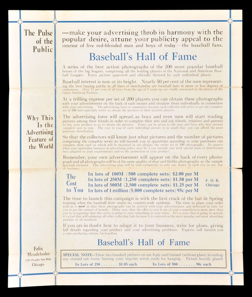 It does appear that Mendelsohn may have pitched his cards to newspapers before this mailer went out because no known newspaper ads appear on the back of cards except for Altoona Tribune, and yet it seems foolish to me that they would have opted out of Mendelsohn's offer to print something there for them. Importantly, the Tribune did not promote its cards to the public until June 12, 1916, a full two months after the other papers, and it was selling the later-issued m101-4s, not the m101-5s tied to the Chicago Examiner, Iowa, Oklahoma and Arkansas papers, so Altoona likely was aware of Mendelsohn's mailer terms. Anyway, given that these other newspapers were offering "sets" of 100 or 200 cards for each fulfilled coupon, I would assume they had pretty good size amounts on hand, and the lack of any being found with back advertising in the past century solidly supports that they were blank backed.