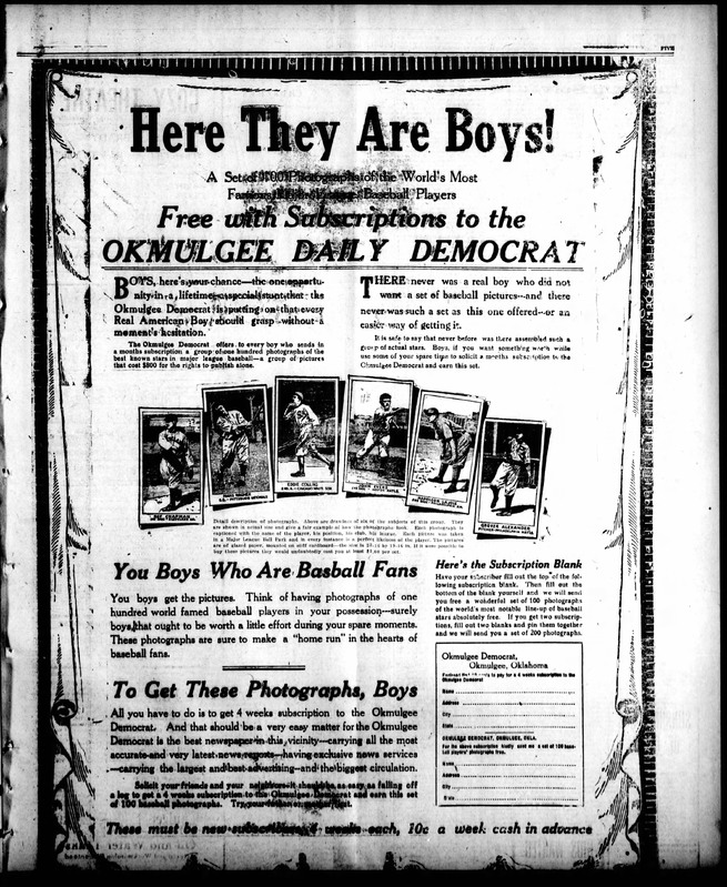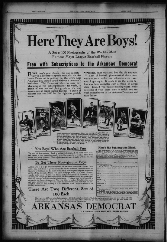 In conducting recent research I have found that two  other newspapers (besides Altoona Tribune) advertised the m101 Mendelsohn sets– The Okmulgee (OK) Daily Democrat and the Arkansas Democrat.  I found full-page ads for Okmulgee dated April 3, 1916 and April 23, 1916.  Each had drawing-ish likenesses of the actual poses used for Chapman, Wagner, Collins, Evers and Alexander, although no card numbers were shown.  It also included a pic of the Napoleon Lajoie “card” but it had the hands on hips pose found in the Mendelsohn flyer and the 1915 M-Unc set.  The ad offered 100 cards to anyone who could get a new four-week subscription sold and 200 cards if two such subscribers were found– they needed to fill out the coupon/form and so did the kid who found them. The two ads appear to be identical.  No indication of whether the backs had anything on them.