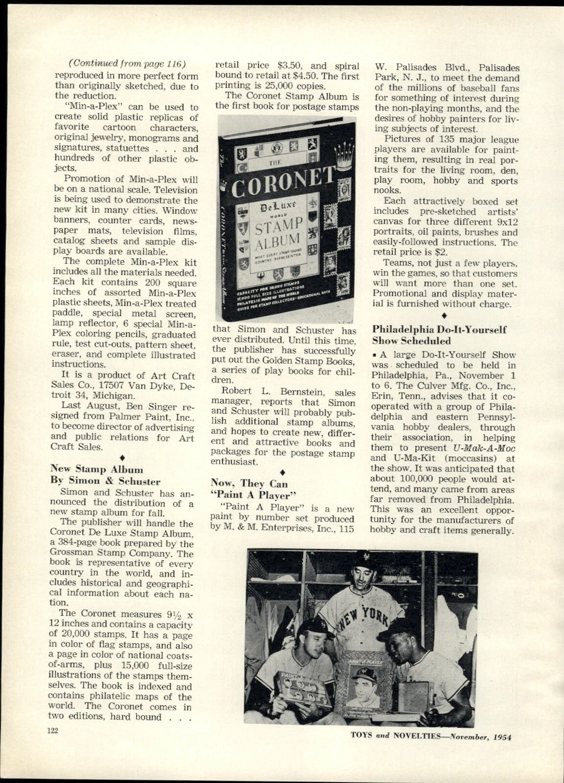 The item is rarely seen and this is the first one with that I have seen with only Dodgers. There are 2 different boxes: the one shown in the original thread and one with Musial instead of Mantle (not sure about all the other players). I attached an article from a 1954 toys and novelties magazine describing the game. I tried uploading some other photos but had no luck. It seems anything taken by my phone doesn't upload on net54. |