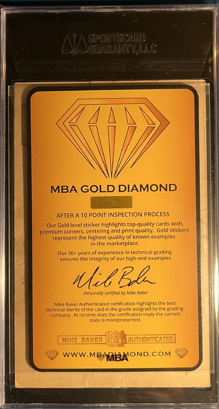 Cards that receive a Gold Diamond Certification are determined worthy of a higher technical grade from MBA. These are truly exceptional examples within the assigned technical grade, generally representing the top 5% of the population, for that grade. A Diamond Certified trading card must achieve a 0.5 technical grade increase, or higher, to receive the Gold Diamond designation.